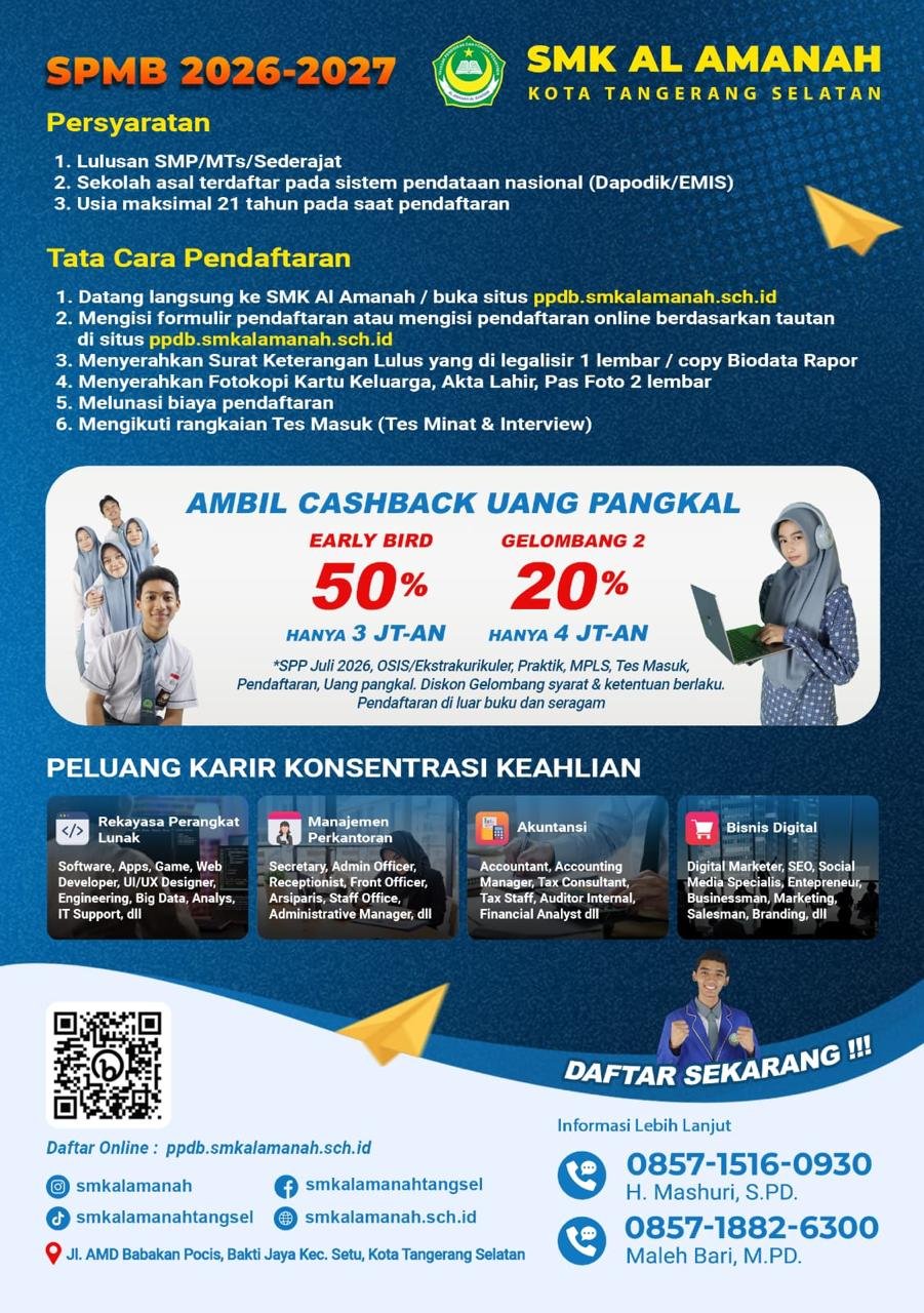 Sistem Penerimaan Siswa Baru (SPMB) SMK Al Amanah Tahun Ajaran 2026/2027 Telah di Buka. Sekolah yang beralamat di Jl. Raya Pupsiptek, Babakan Pocis, Bakti Jaya, Kota Tangerang Selatan telah eksis bersama membangun pendidikan dalam mencerdaskan kehidupan bangsa.